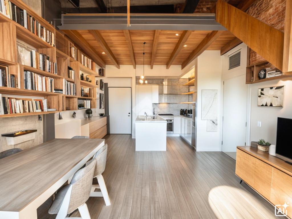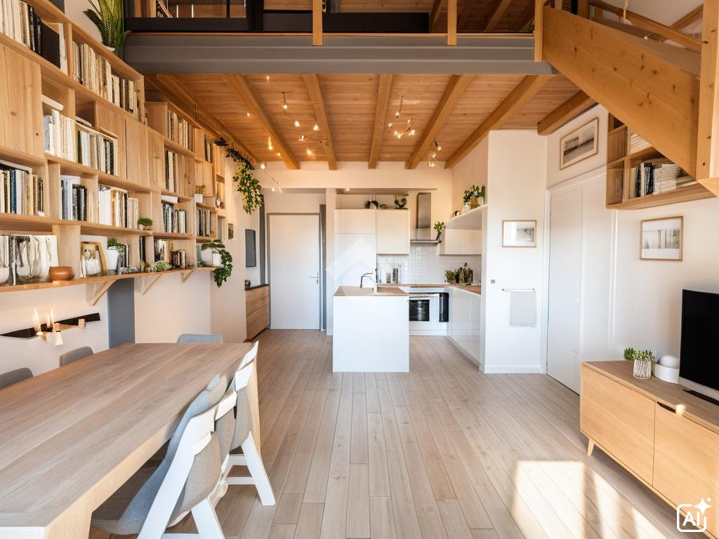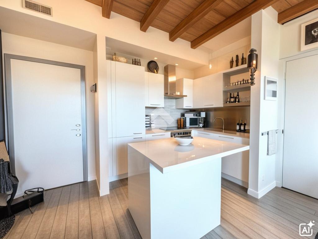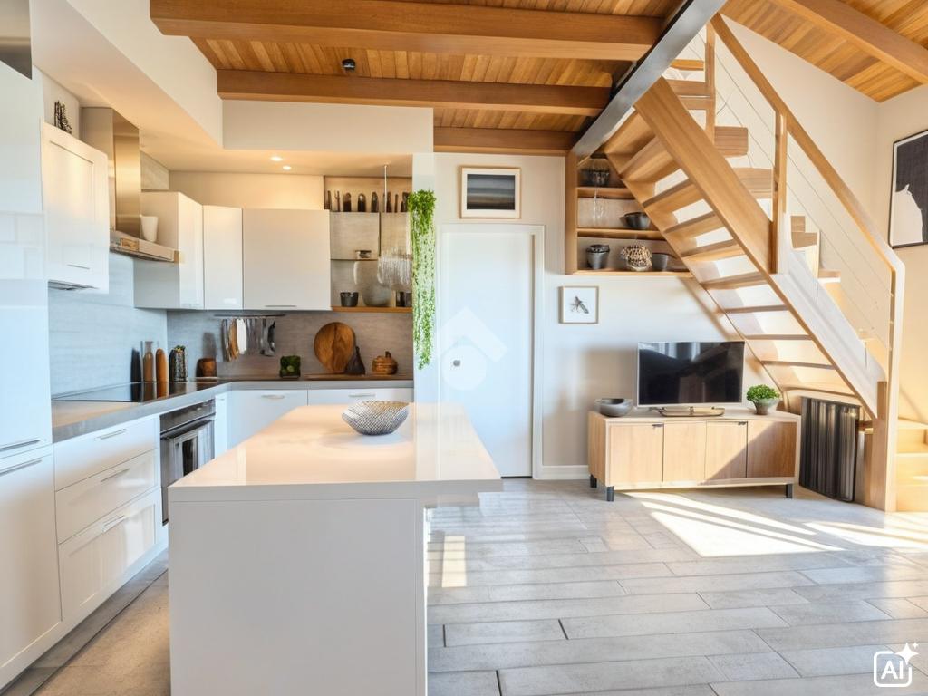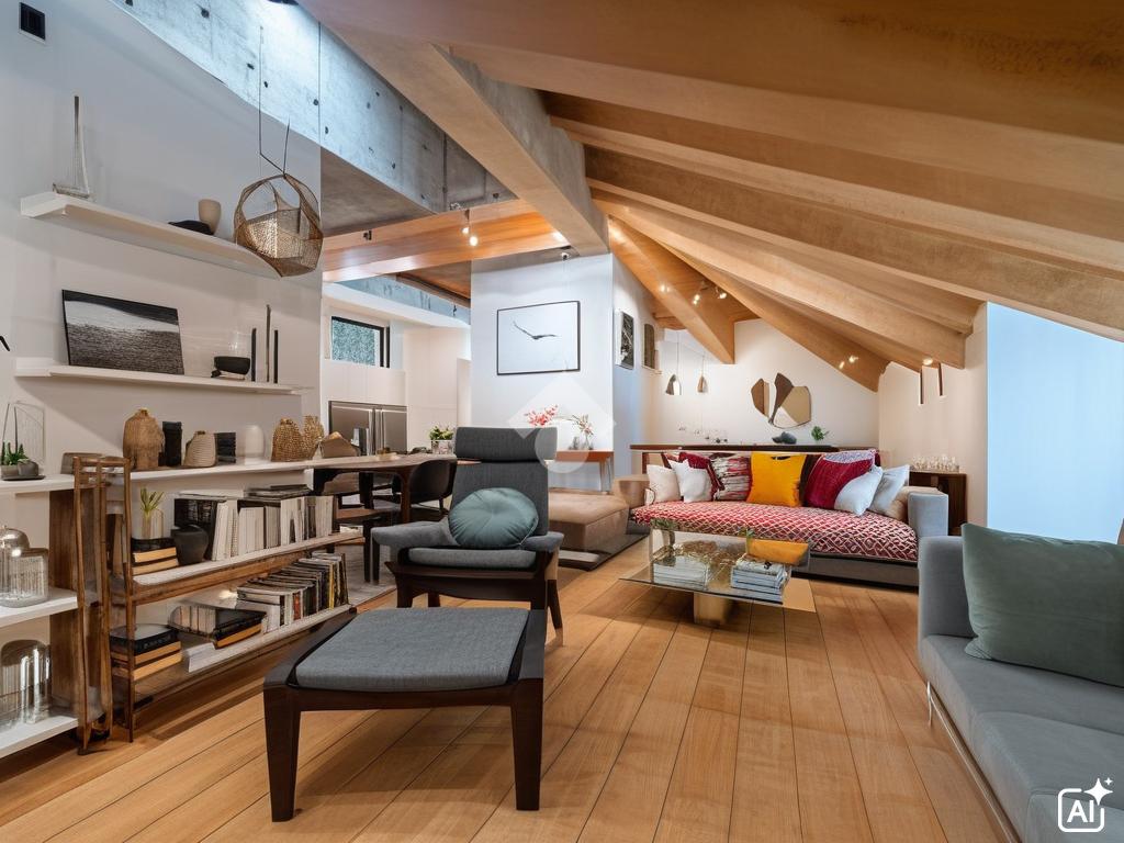 La zona giorno si apre su un luminoso soggiorno open space con angolo cottura caratterizzato da travi a vista e soppalco, ideale come spazio aggiuntivo utilizzabile come locale hobby in base alle proprie esigenze.