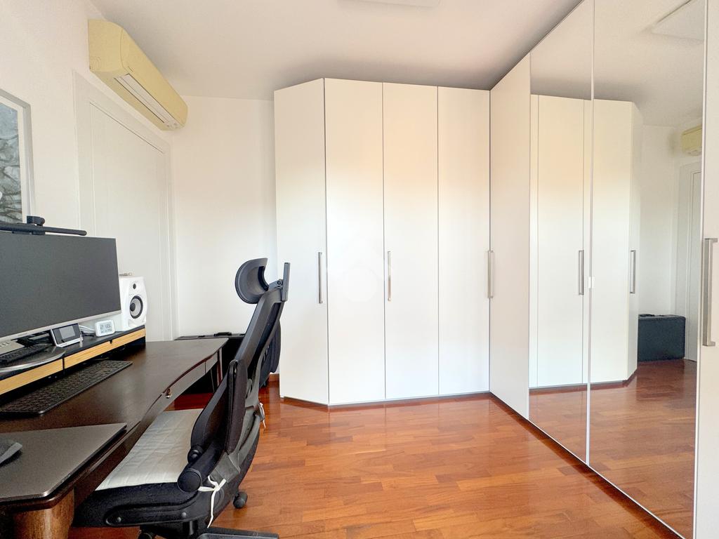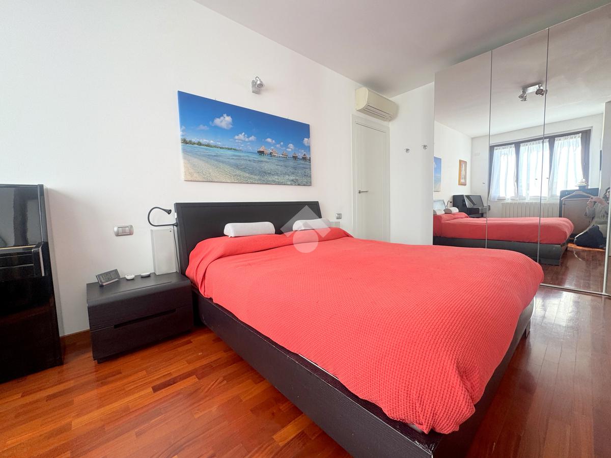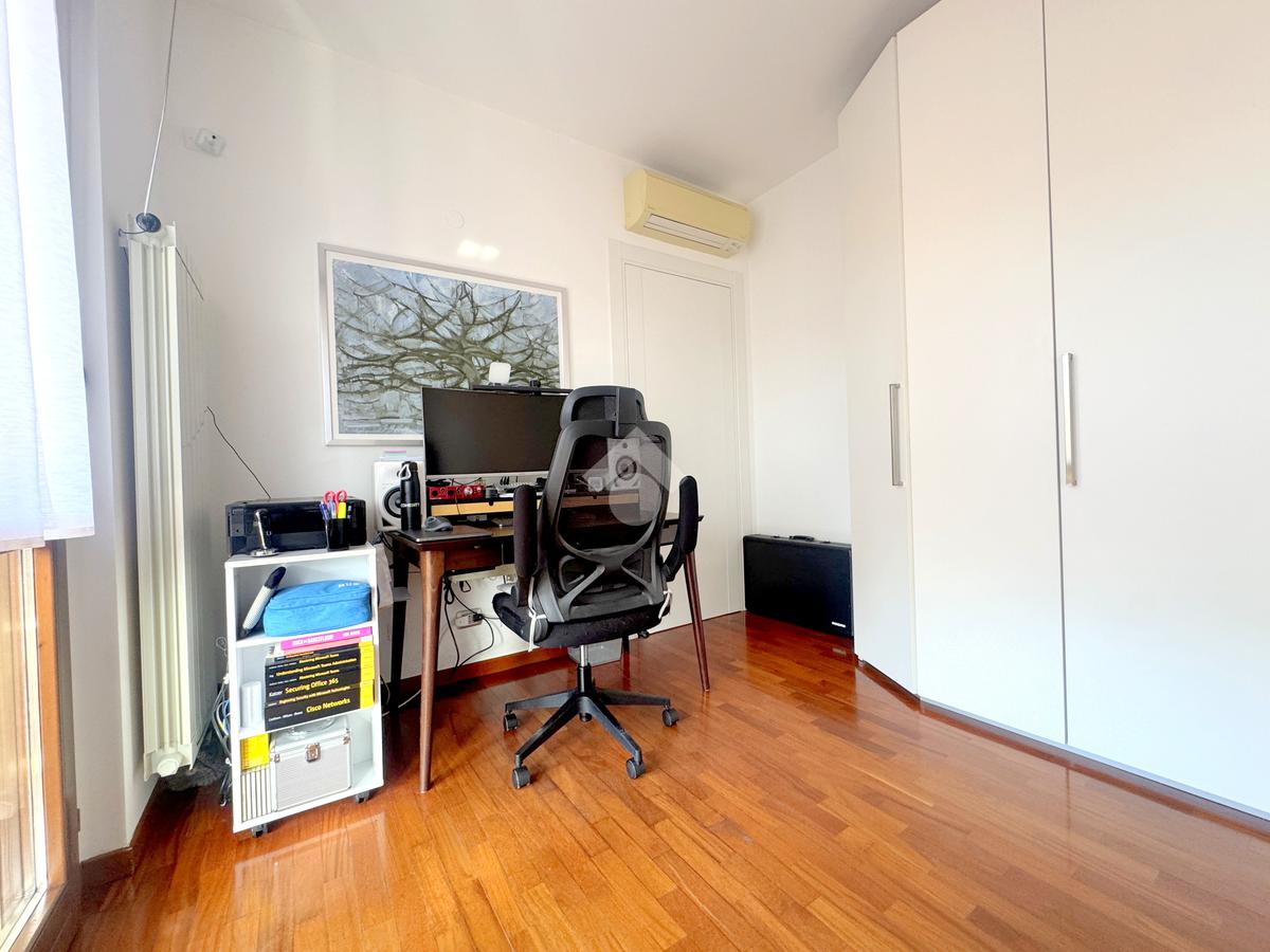 La zona notte, ben separata e studiata per garantire privacy e tranquillità, si compone di una camera matrimoniale e di una cameretta, quest’ultima collegata al secondo terrazzo attrezzato con attacco per lavatrice e lavello, ideale anche come pratico spazio di servizio, il tutto si completa con due bagni, entrambi finestrati.